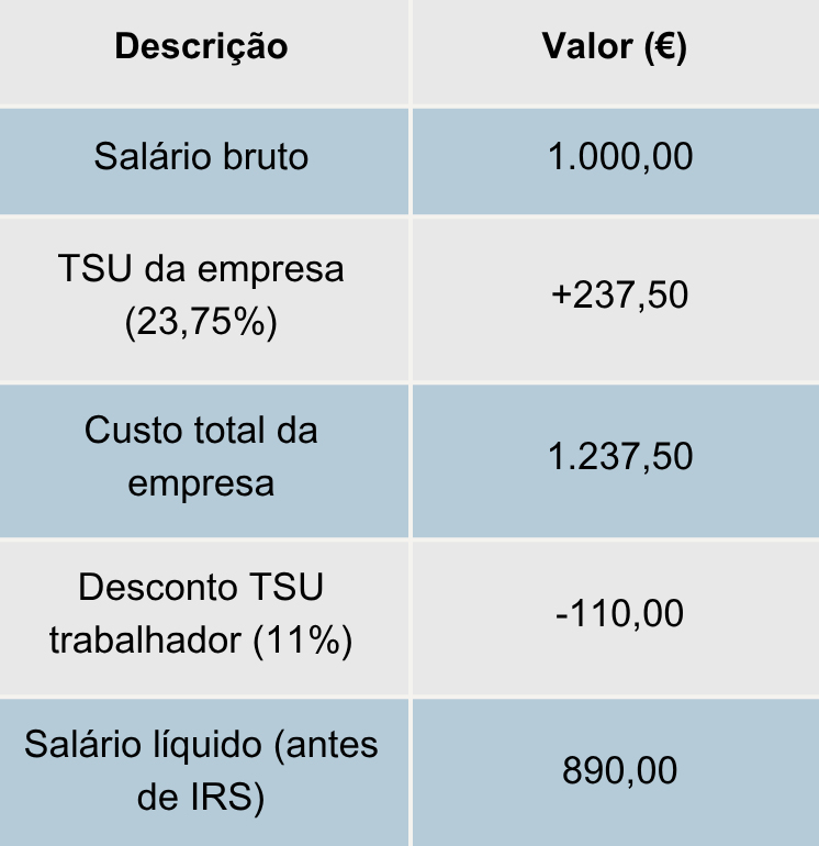 - Para um salário bruto de 1.000€, o custo real da empresa é de 1.237,50€ por mês.